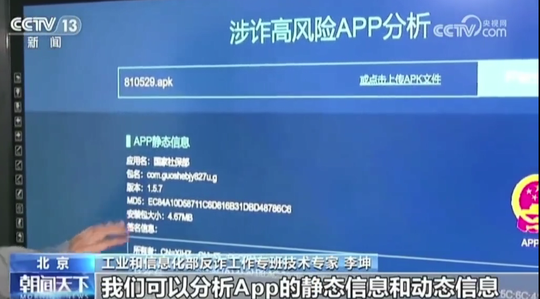 工業(yè)和信息化部反詐工作專班技術(shù)專家 李坤:通過上傳App的安裝包,我們可以分析App的靜態(tài)信息和動(dòng)態(tài)信息。靜態(tài)信息主要包含一些外在的特征,比如App的外在圖標(biāo),它涉詐圖標(biāo)就是采用的國徽,它的名稱盜用了國家社保部(人社部)的名字,其他的是一些它的基本特征。實(shí)際上我們從外部的這些特征里可以看到,它會(huì)巧借國家公信力的名義去欺騙大眾,讓大眾誤以為這是國家主導(dǎo)或者國家支持的一些資助項(xiàng)目,進(jìn)而引導(dǎo)用戶進(jìn)行投資。通過對(duì)圖標(biāo)、名稱以及內(nèi)在進(jìn)行分析,我們可以認(rèn)定這就是一個(gè)涉詐的App。