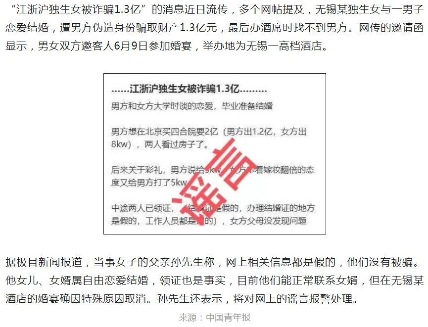 6月15日,江蘇無錫市公安局錫山分局發(fā)布通報(bào)稱,無錫居民浦某某(女,42歲)13日在微信群內(nèi)討論“江浙滬獨(dú)生女被詐1.3億”等不實(shí)言論,并僅憑主觀聯(lián)想,與某集團(tuán)女高管關(guān)聯(lián),通過網(wǎng)絡(luò)傳播擴(kuò)散造成不良影響。目前,公安機(jī)關(guān)已依法對浦某某處以行政拘留。
